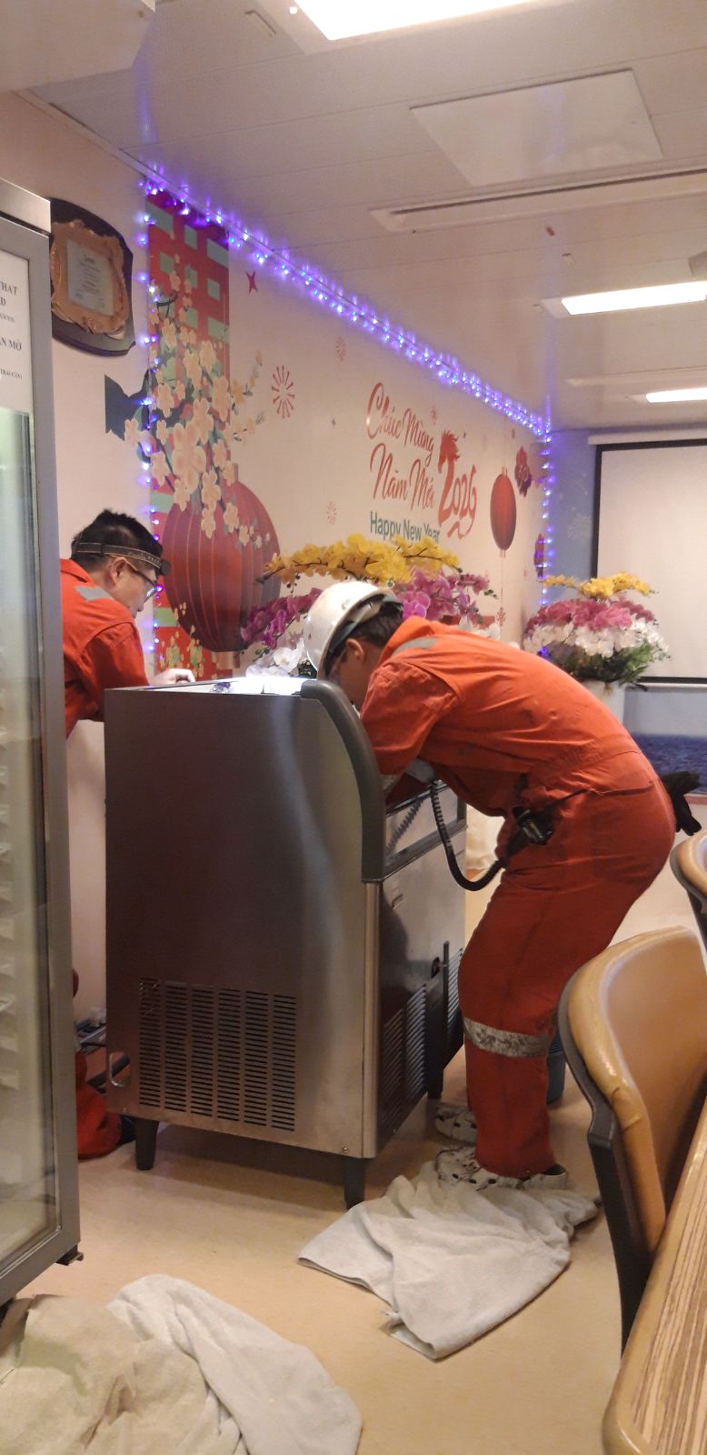 2052 2026-02-10 Nguyễn văn Sơn Quan sát thấy anh em M&R vệ sinh máy làm nước đá rất sạch sẽ .Làm việc trang bị đầy đủ bảo hộ rất an toàn trách nhiệm cao. Goodjob PSV Catering Operations Nhà ăn Ngày Safe Image