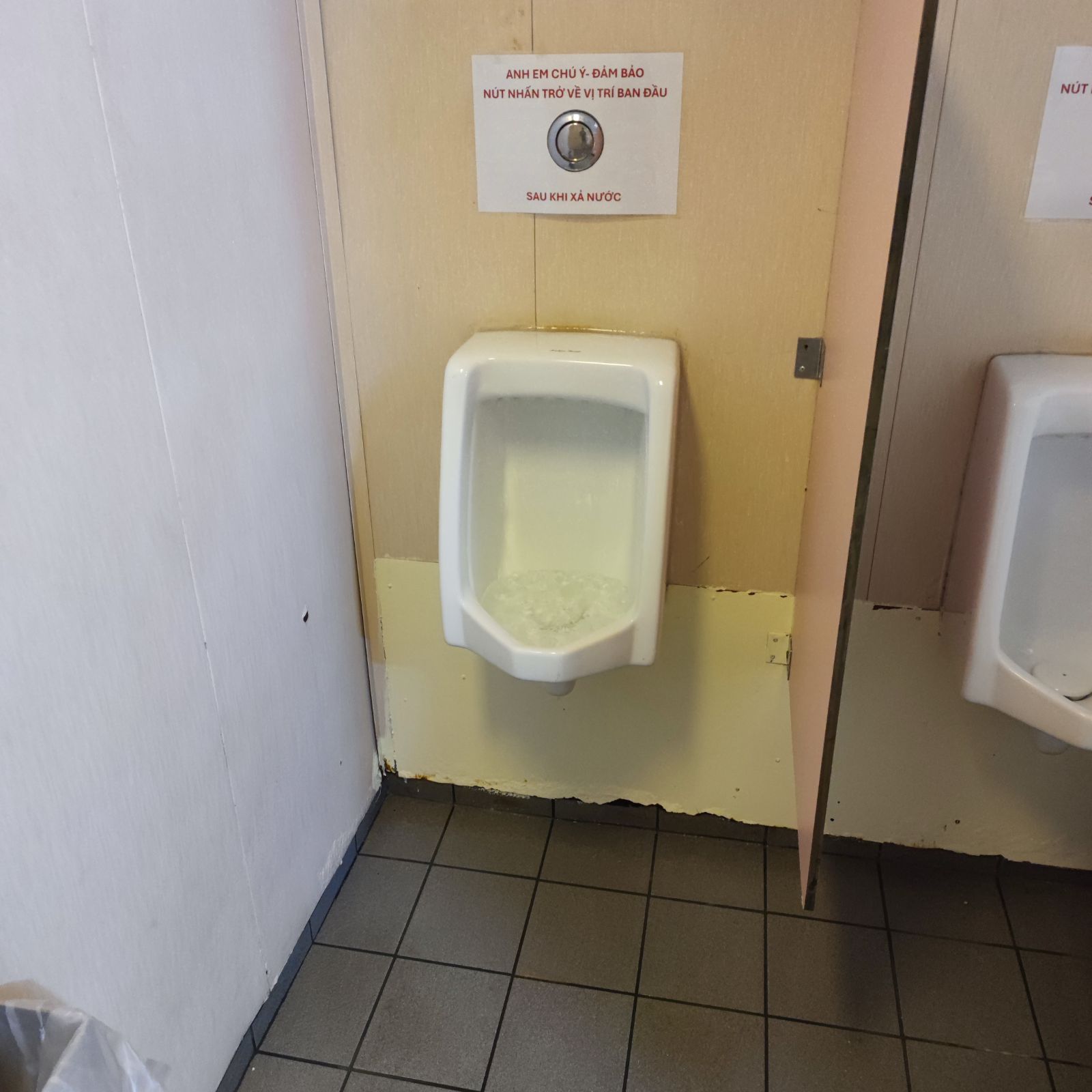 Tôi quan sát thấy nút bấm xả nước của bồn đi tiểu bị kẹt nước chảy tràn ra mặt sàn, tôi đã điều chỉnh lại nút bấm.