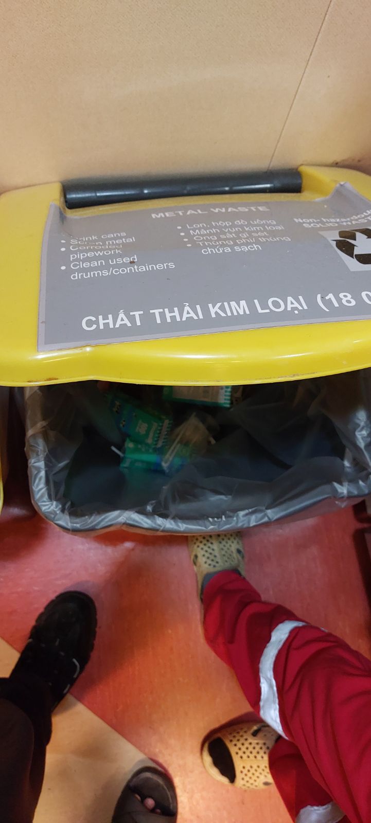 1141 2025-11-03 Nguyen Van Binh Tôi thấy có vỏ hộp sữa ở trong thùng rác đựng kim loại ở nhà ăn.Tôi đã nhặt ra,anh em nhớ phân loại rác cho đúng.Xin cảm ơn. PSV Catering Operations Nhà ăn Ngày Unsafe Image